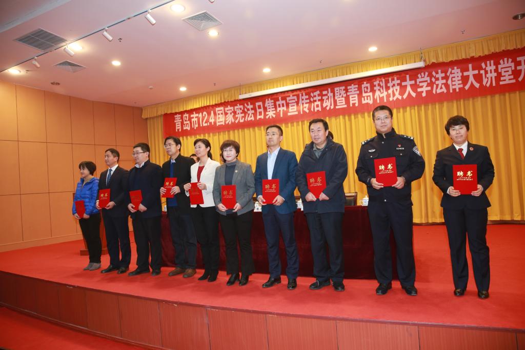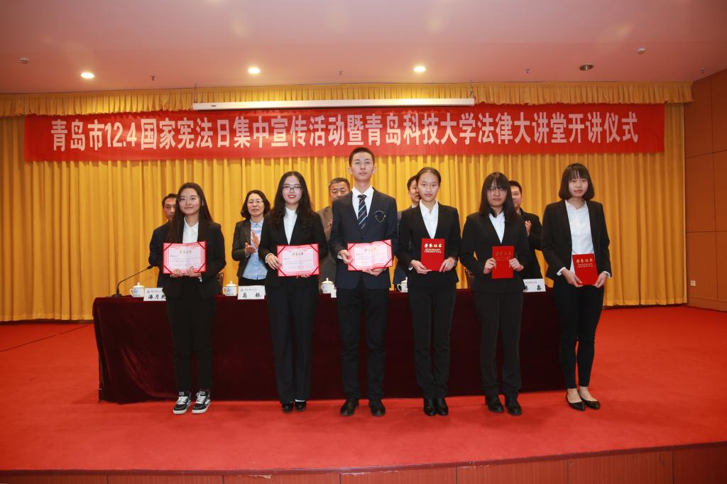 会上为包括我院宋敏、綦磊、张亮老师在内的青岛市“普法讲师团”讲师颁发了聘书,为近期学校开展的征文比赛、演讲比赛等国家宪法日系列活动的获奖同学颁发了证书。