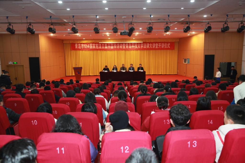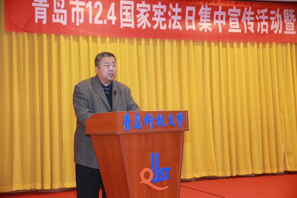 12月4日下午,学校与青岛市司法局、普法办、教育工委联合主办的青岛市“12.4”国家宪法日集中宣传活动在崂山校区第三报告厅举行,beat365中国官网党委副书记张元利出席并致辞,青岛市普法办副主任冯思睿、青岛市司法局法制宣传处处长潘月民、青岛市教育工委思政处处长高桥、beat365中国官网副院长李鑫,宣传部、团委及法律事务办公室相关负责人出席会议。