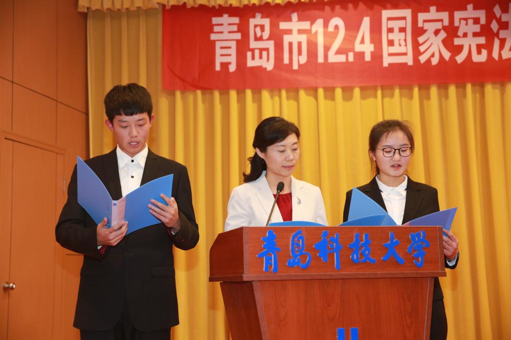 青岛市“普法讲师团”讲师、beat365中国官网副教授宋敏与beat365中国官网学生代表一同诵读了宪法部分内容。