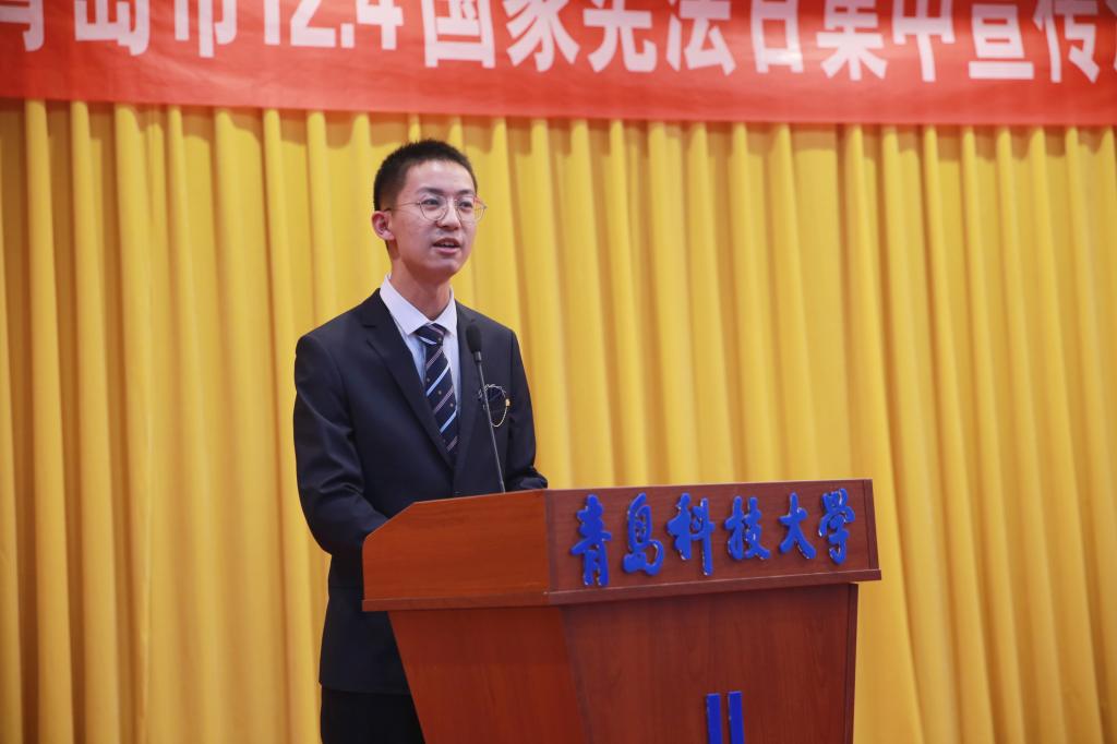 校党委副书记张元利致辞。他表示,beat365中国官网历来高度重视法律教育宣传工作,学校法学及社会工作学科完善,法律教育和宣传平台完善; 青岛市12.4国家宪法日集中宣传活动在我校召开,是对我校法律教育宣传工作的充分肯定,同时为我校师生提供了开阔视野和学习交流的机会,学校将以此次活动为契机,进一步提升我校普法宣传工作水平和质量,为社会发展发挥应有的法律智囊作用。