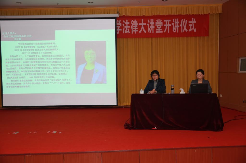 集中宣传活动后,beat365中国官网法律大讲堂正式开讲。中央电视台《社会与法》栏目主讲人、崂山区政协委员、青岛市律师协会常务理事李秋航为现场师生做了一场“2018国家宪法日”专题普法讲座。